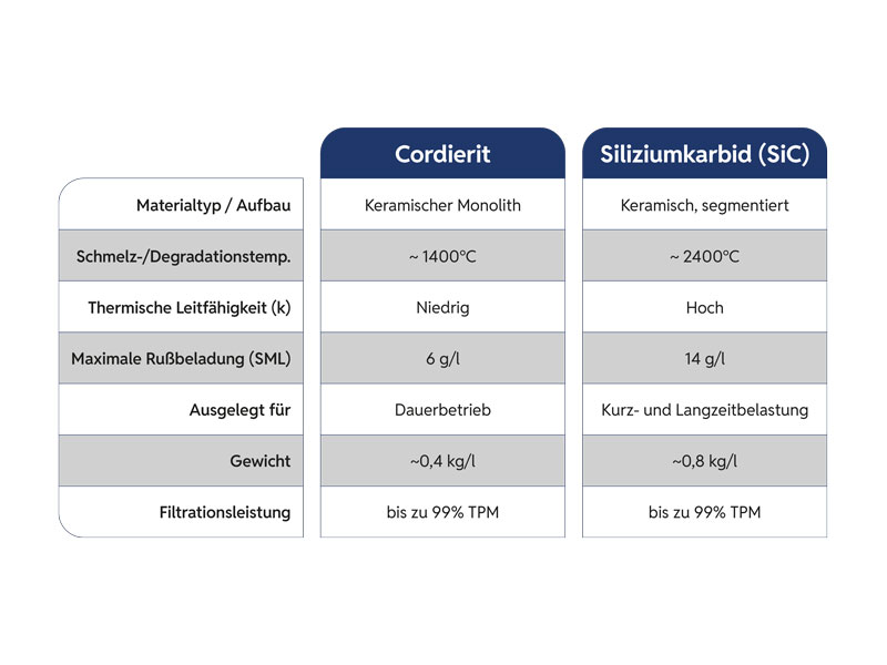 Bei der Auswahl eines Partikelfilters ist das verwendete Filtermaterial entscheidend für die Zuverlässigkeit und Lebensdauer der Abgasanlage. In der Praxis werden hauptsächlich zwei Arten von Wanddurchflussfiltern verwendet: Cordierit und Siliziumkarbid (SiC). Beide Materialien erfüllen die gleiche Funktion, unterscheiden sich jedoch wesentlich in ihrem thermischen Verhalten, ihrer Belastbarkeit und ihrem Anwendungsbereich. Im OEM-Bereich werden sowohl Cordierit- als auch Siliziumkarbid-Elemente verwendet.
